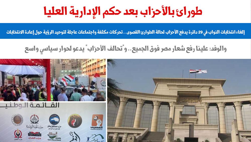 طورائ بالأحزاب بعد حكم الإدارية العليا بإلغاء انتخابات النواب في 29 دائرة يدفع الأحزاب لحالة الطوارئ القصوى..تحركات مكثفة واجتماعات عاجلة لتوحيد الرؤية حول إعادة الانتخابات..الوفد: علينا رفع شعار مصر فوق الجميع