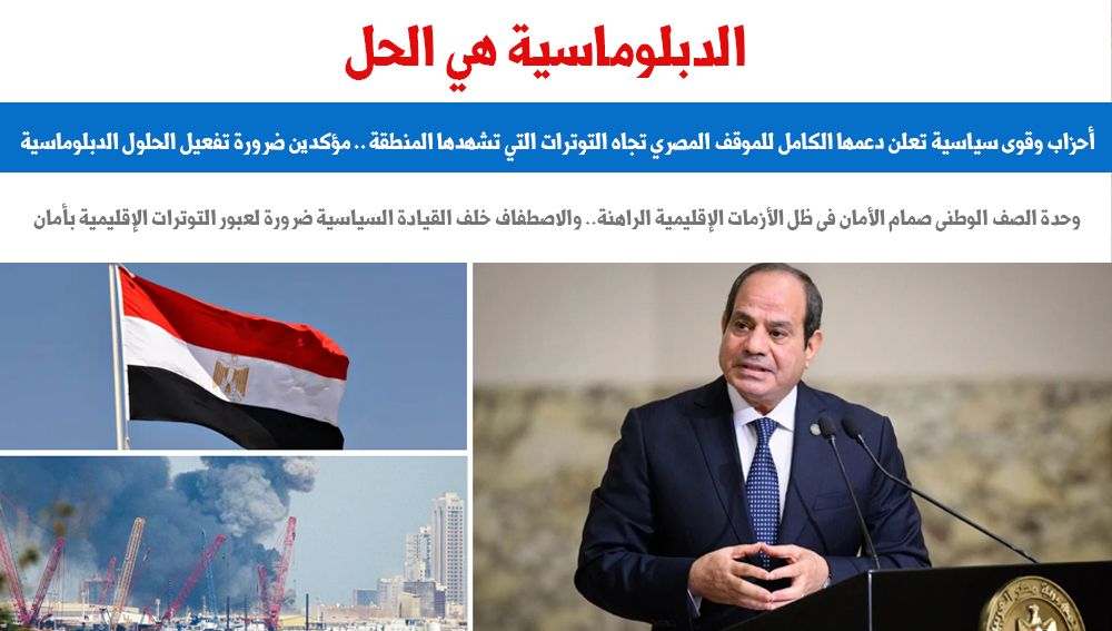 الدبلوماسية هي الحل.. أحزاب وقوى سياسية تعلن دعمها الكامل للموقف المصري تجاه التوترات التي تشهدها المنطقة .. مؤكدين ضرورة تفعيل الحلول الدبلوماسية..وحدة الصف الوطنى صمام الأمان فى ظل الأزمات الإقليمية الراهنة