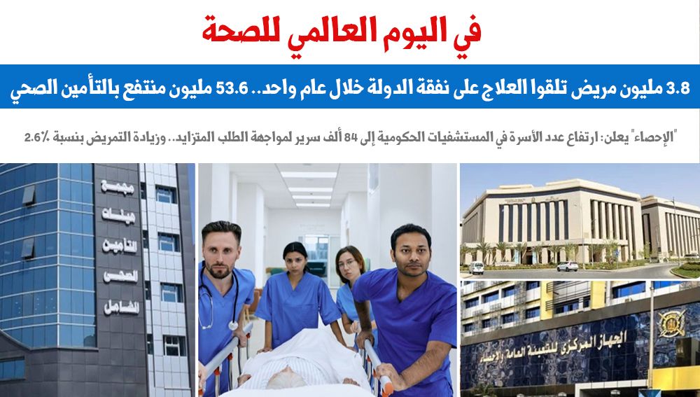في اليوم العالمى للصحة.. 3.8 مليون مريض تلقوا العلاج على نفقة الدولة خلال عام واحد.. "الإحصاء": ارتفاع عدد الأسرة فى المستشفيات الحكومية إلى 84 ألف سرير لمواجهة الطلب المتزايد.. و53.6 مليون منتفع بالتأمين الصحى