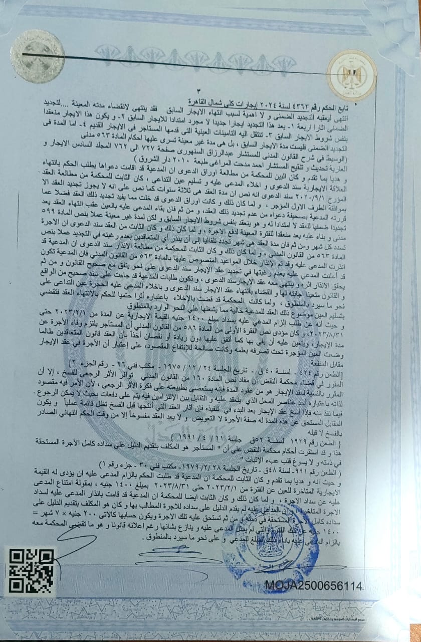 صدر الحكم في الدعوى المقيدة برقم 4363 لسنة 2024 ايجارات كلى شمال القاهرة، لصالح المحامى محمد السيد أمام، برئاسة المستشار عمر نبيل، وعضوية المستشارين حسين عزت، ووليد محمد إبراهيم، وأمانة سر محمد عوض.