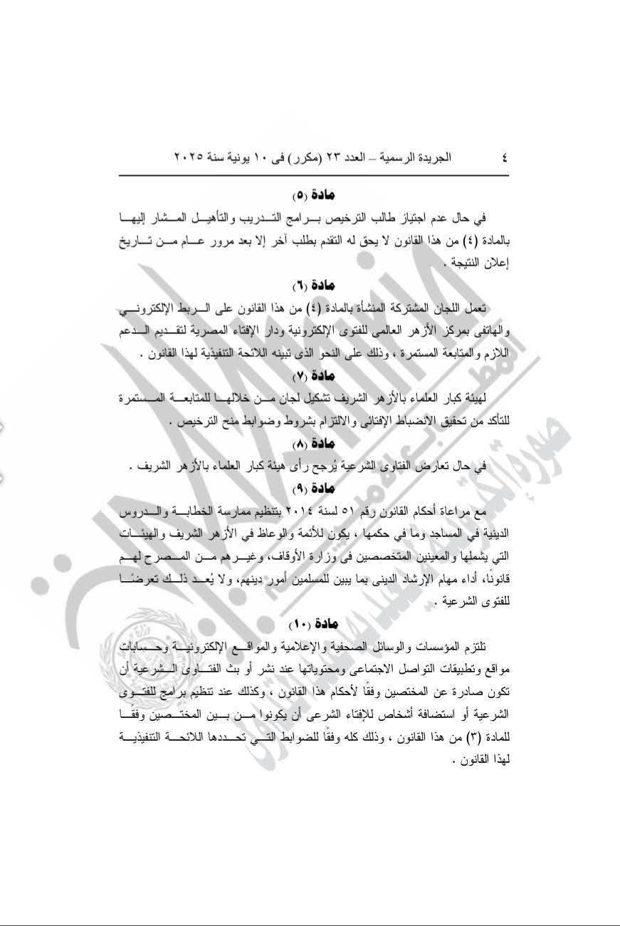 صدور قانون تنظيم الفتوى الشرعية رقم 86 لسنة 2025، وتم نشره بالجريدة الرسمية، الأمر الذى وصفه البعض بتأميم الفتوى الشرعية وقصرها على جهات وأشخاص محددة فقط، ما يضعه بين المزايا والعيوب أحياناً، فبداية من اليوم أي إفتاء في الدين سواء علي الفيس بوك أو أي وسيلة تواصل أو قناة فضائية أو راديو مسموع أو في المساجد بدون الشروط الي حددها القانون وبدون تصريح، العقوبة ستكون صارمة للمخالفين وهى غرامة من 50 ألف لـ100 ألف جنيه أو حبس لا يزيد عن 6 شهور .
